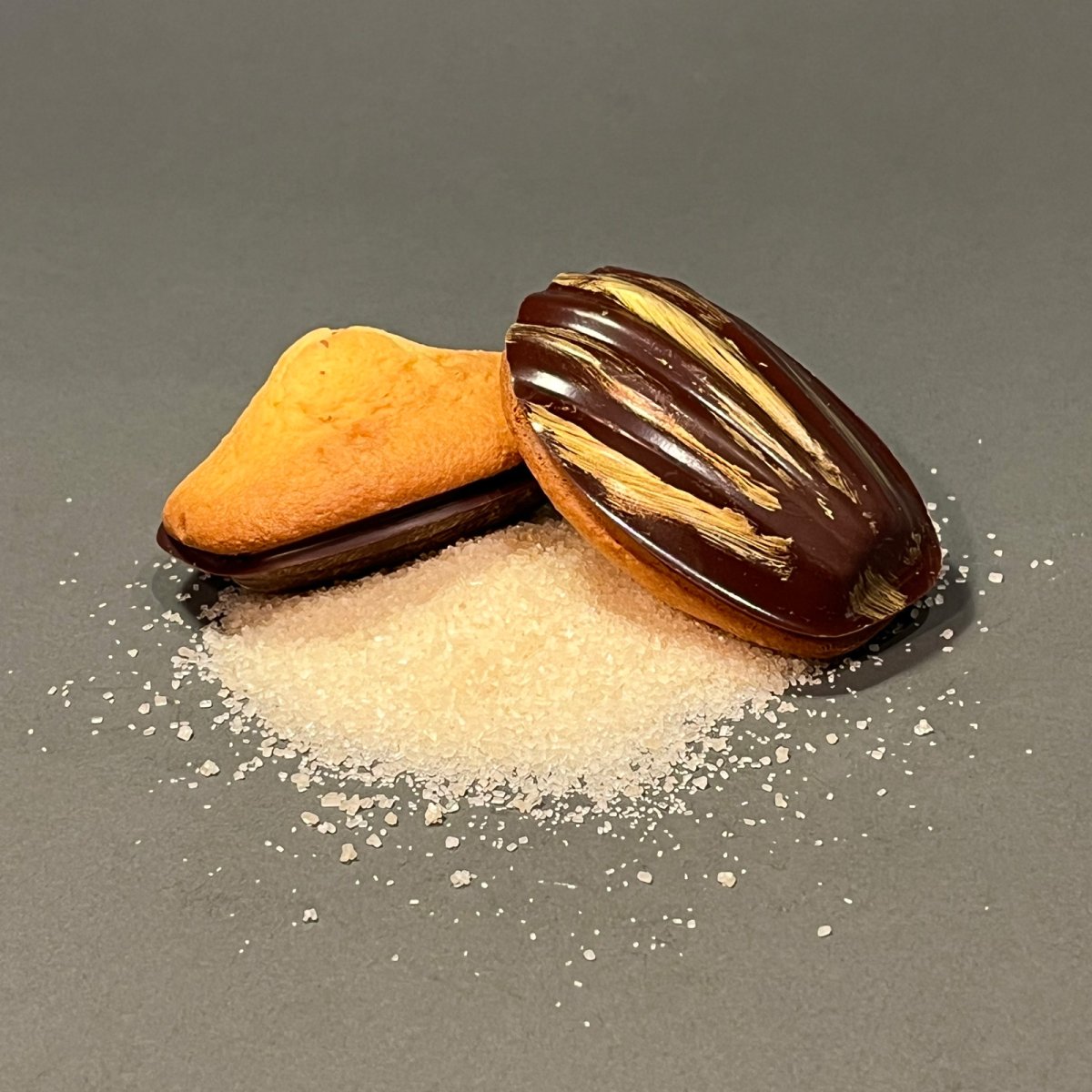 Madeleines gourmandes, cœur coulant de caramel beurre salé maison, enrobage intense de chocolat noir Grand Cru.