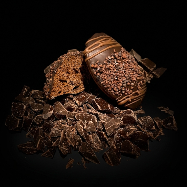 Avis aux amateurs de cacao… Cette madeleine intensément chocolatée cache de généreux éclats de chocolat noir, avant de se laisser enrober d’une fine coque croquante sublimée par des grués de cacao.