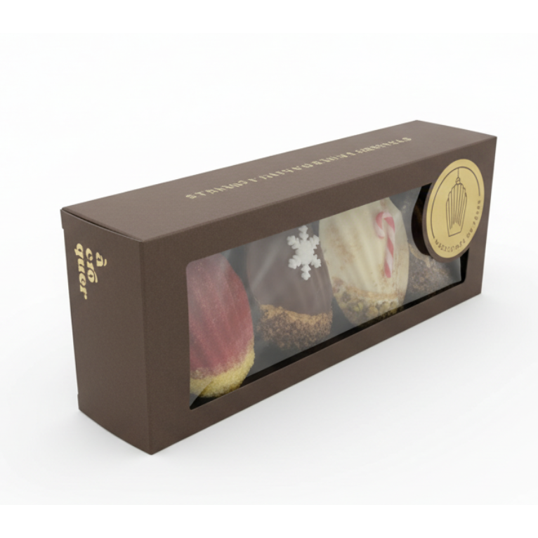 Assortiment de 4 madeleines délicieusement fourrées et décorées pour les Fêtes. Coeur caramel beurre salé et chocolat noir, coeur pistache chocolat blanc et éclats de pistache, coeur noisettes chocolat au lait et éclats de noisette, coeur orange chocolat blanc et épices de Noël.