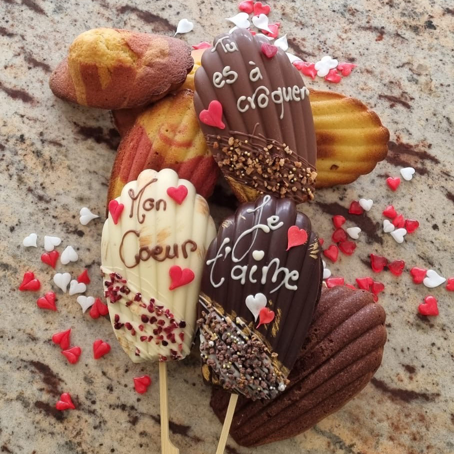 Dites-les avec une madeleine ! Pour la St-Valentin, nous vous avons préparé des madeleines-sucettes avec des jolis messages. N'hésitez pas et savourez à deux…